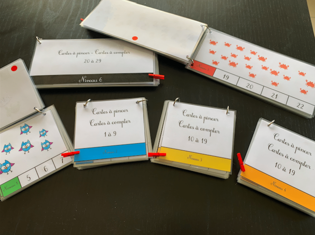 Cet atelier permet de travailler l’autonomie, le dénombrement et la confiance en soi. Le fait que les cartes soient réparties en 6 niveaux permet la différenciation.