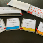 Pour ma classe, j’ai découpé chaque carte, collé une gommette derrière la réponse, plastifié chaque carte et redécoupé. Puis j’ai fait des trous (en haut pour les petites cartes et à gauche pour les grandes cartes) et j’ai relié chaque série avec des anneaux type classeur (que l’on peut trouver à moindre frais sur internet).