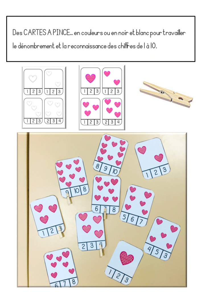 – Des CARTES A PINCE… en couleurs ou en noir et blanc pour travailler le dénombrement et la reconnaissance des chiffres de 1 à 10.