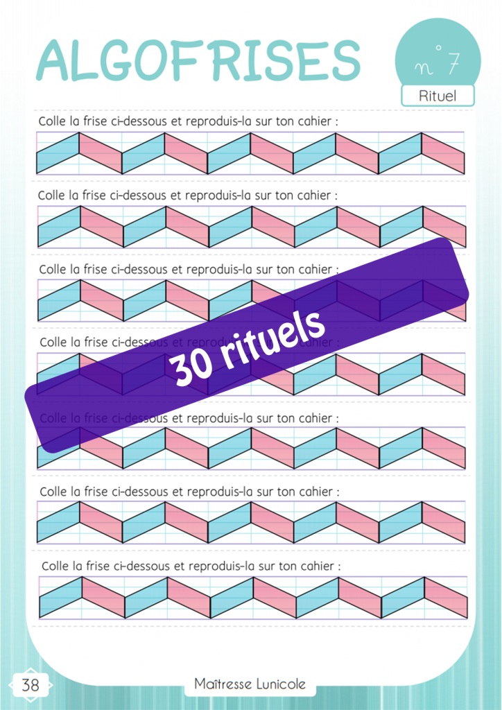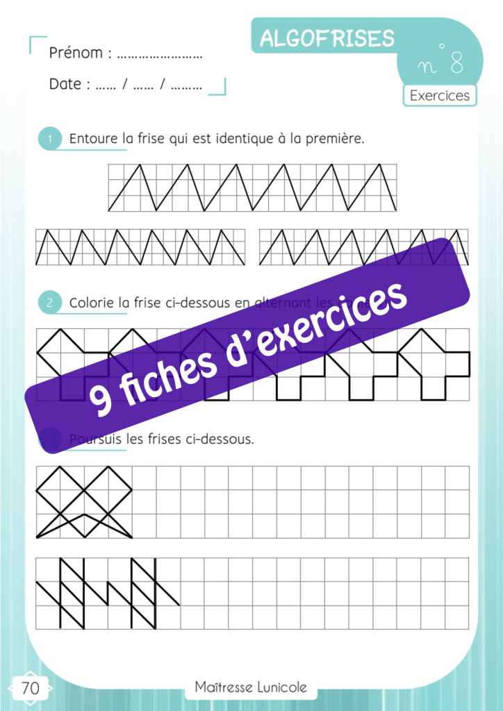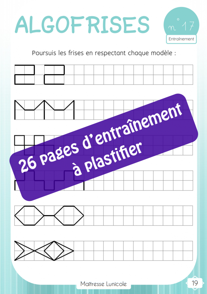 – 26 pages d’entraînement à plastifier avec des frises à poursuivre + 2 fiches pour consigner les résultats des élèves