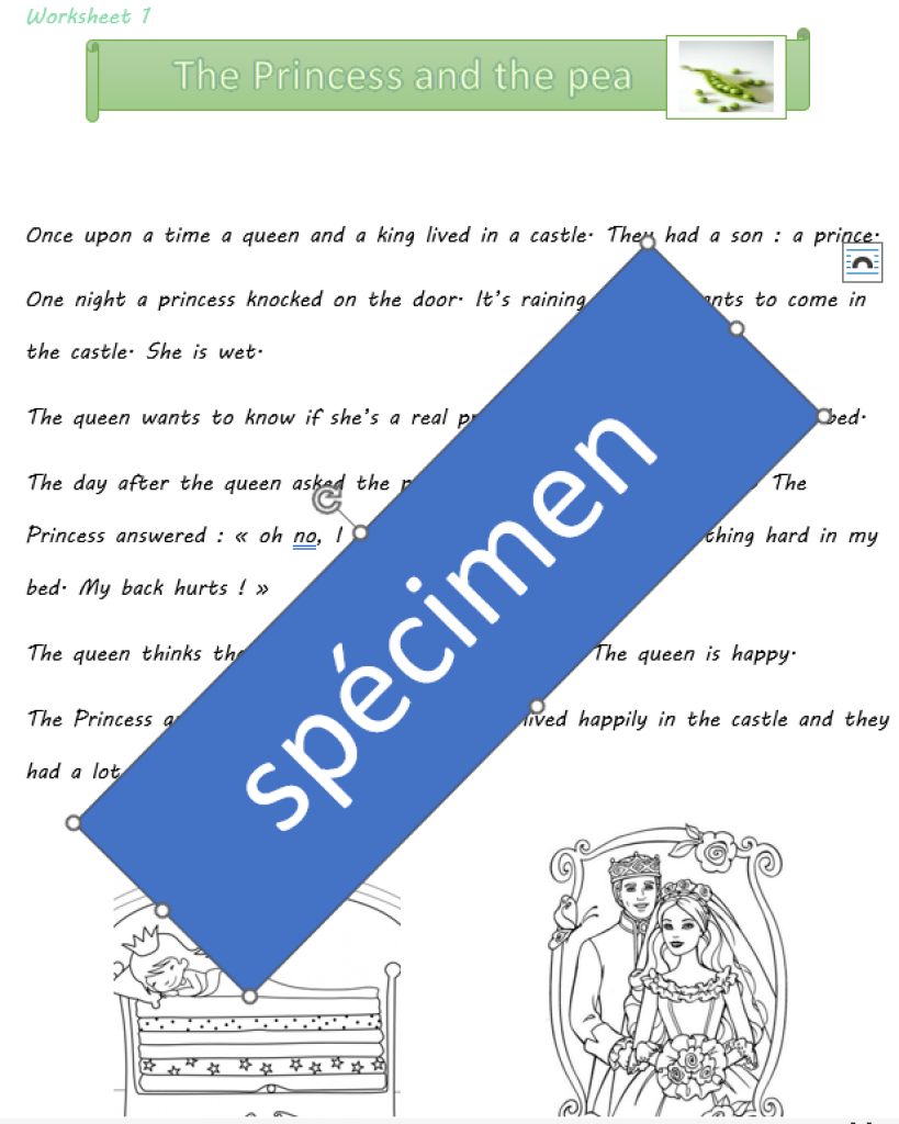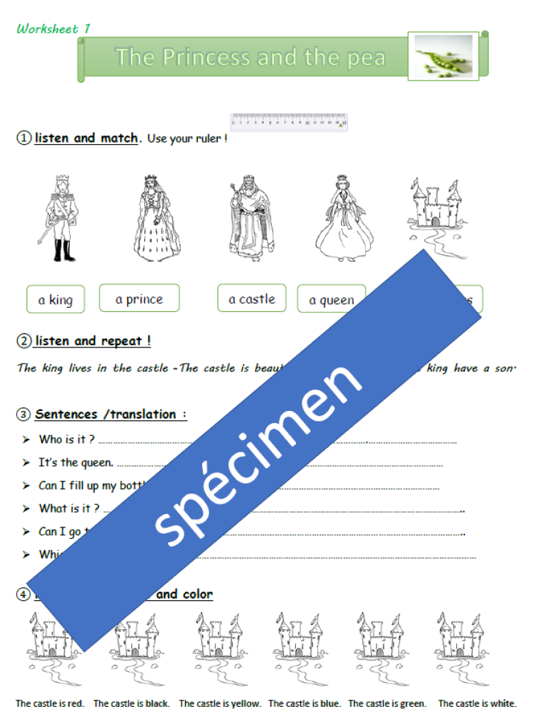 Chaque fiche de travail comporte des exercices de vocabulaire de l’histoire, des exemples de phrases-types pour entraîner son langage oral en Anglais, des questions simples, des exercices pour épeler des mots.