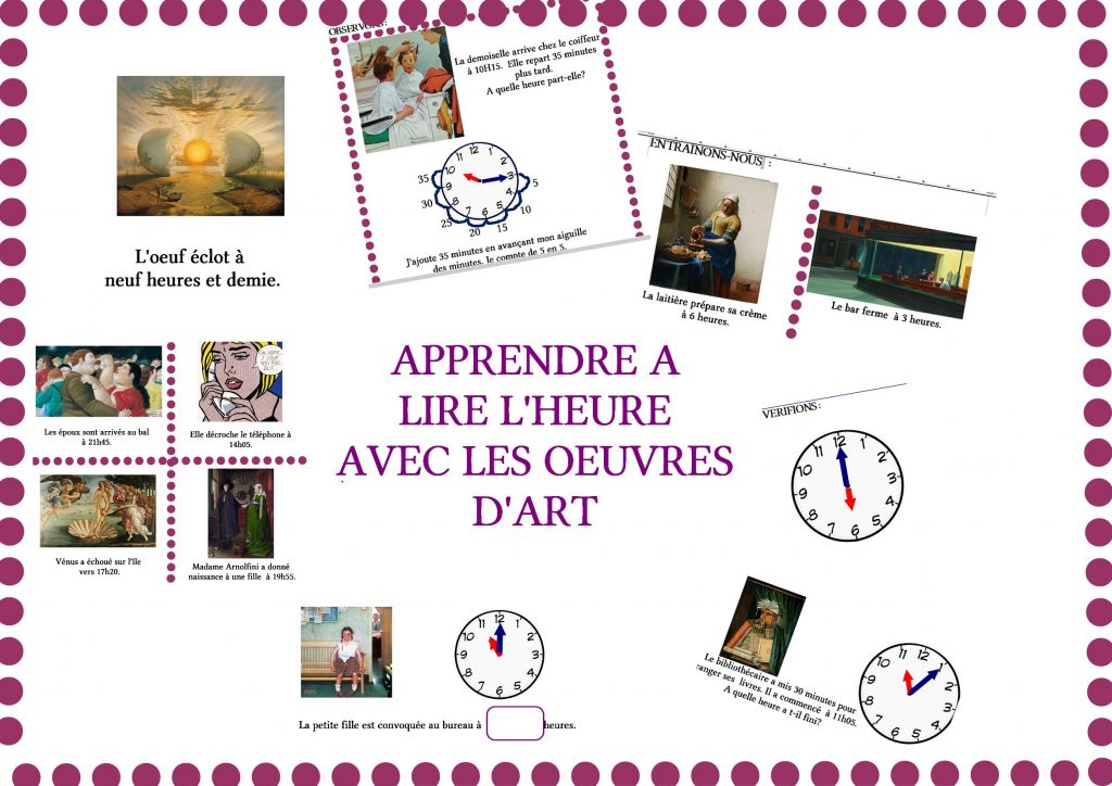 Ce fichier permet d’aborder l’heure (lecture des heures pleines du matin et de l’après midi, des minutes, notions de « demie » , « et quart » et « moins le quart », résolution de problèmes de durée.