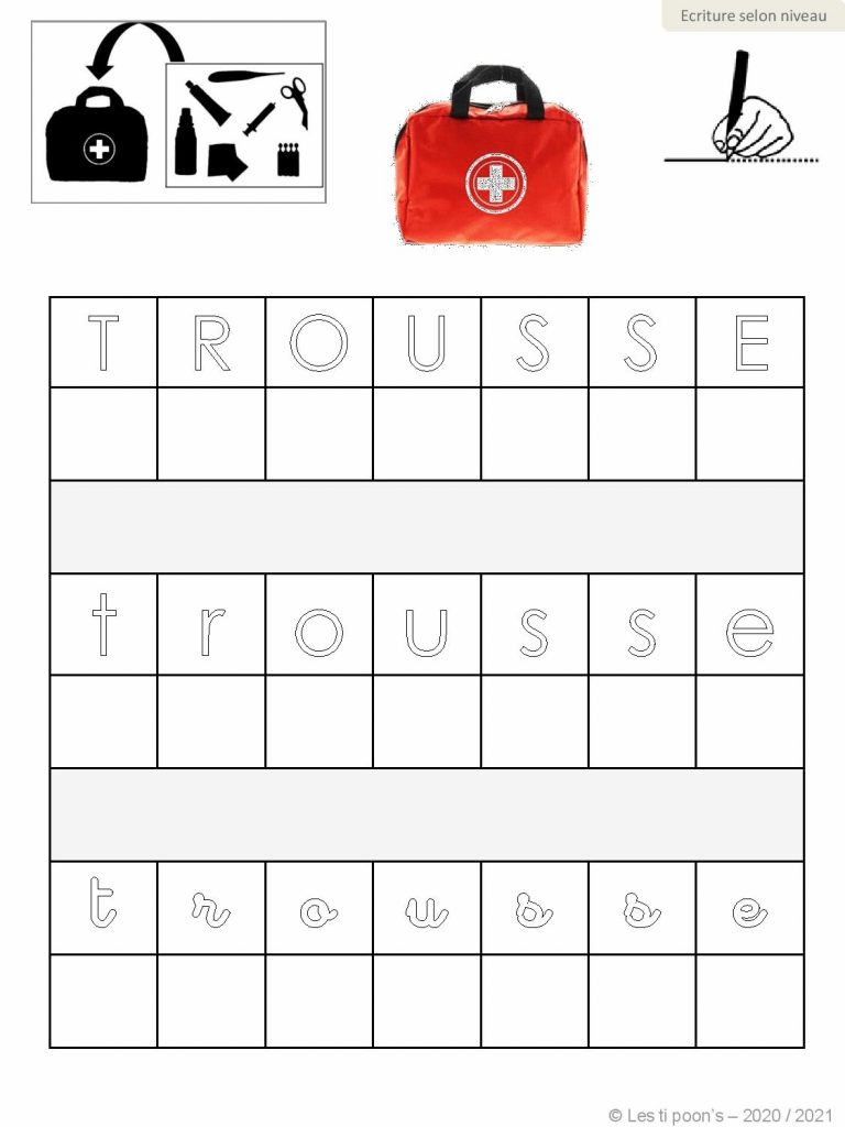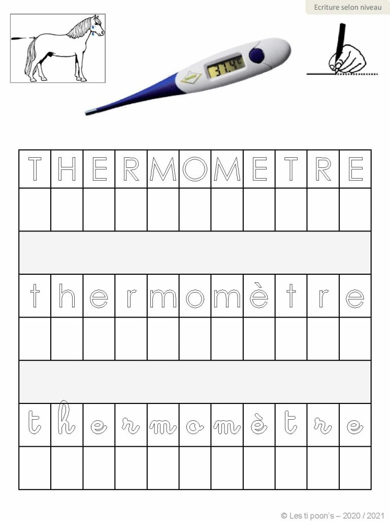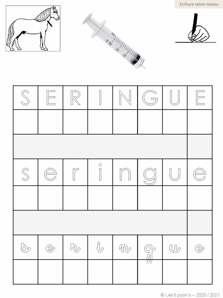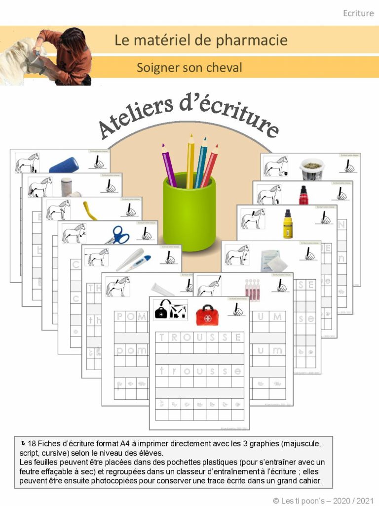 Une compilation de fiches d’écriture illustrées pour s’entraîner à écrire seul(e) ou en repassant dans les lettres, et travailler sur le thème du matériel de pharmacie des équidés.