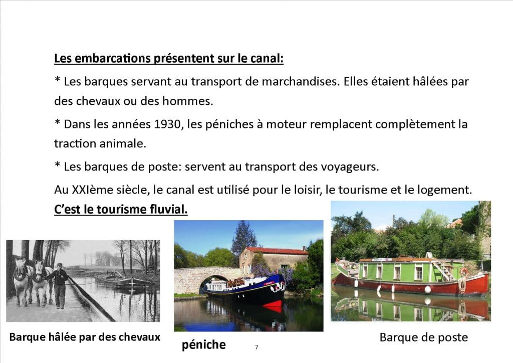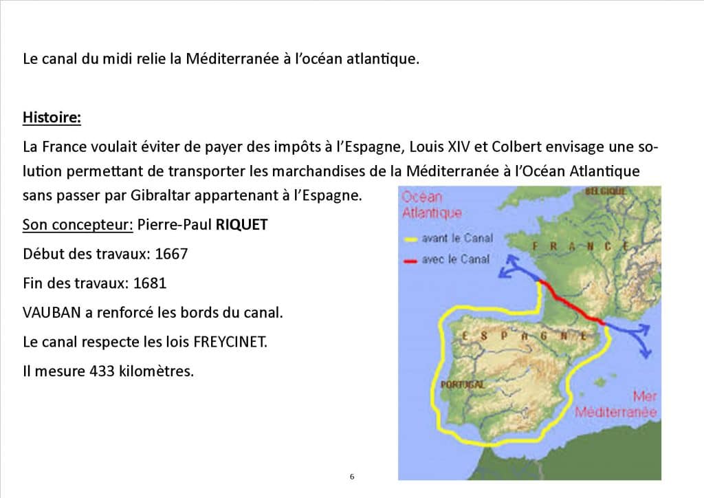 • des informations générales sur le canal du midi: localisation, sa faune et sa flore, ses particularités (monuments, villes traversées,…). Le tout est illustré.