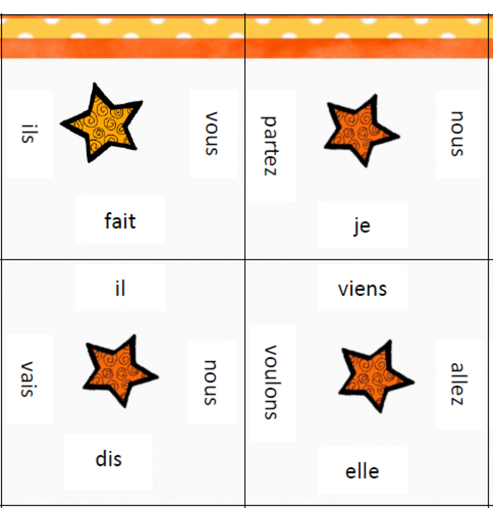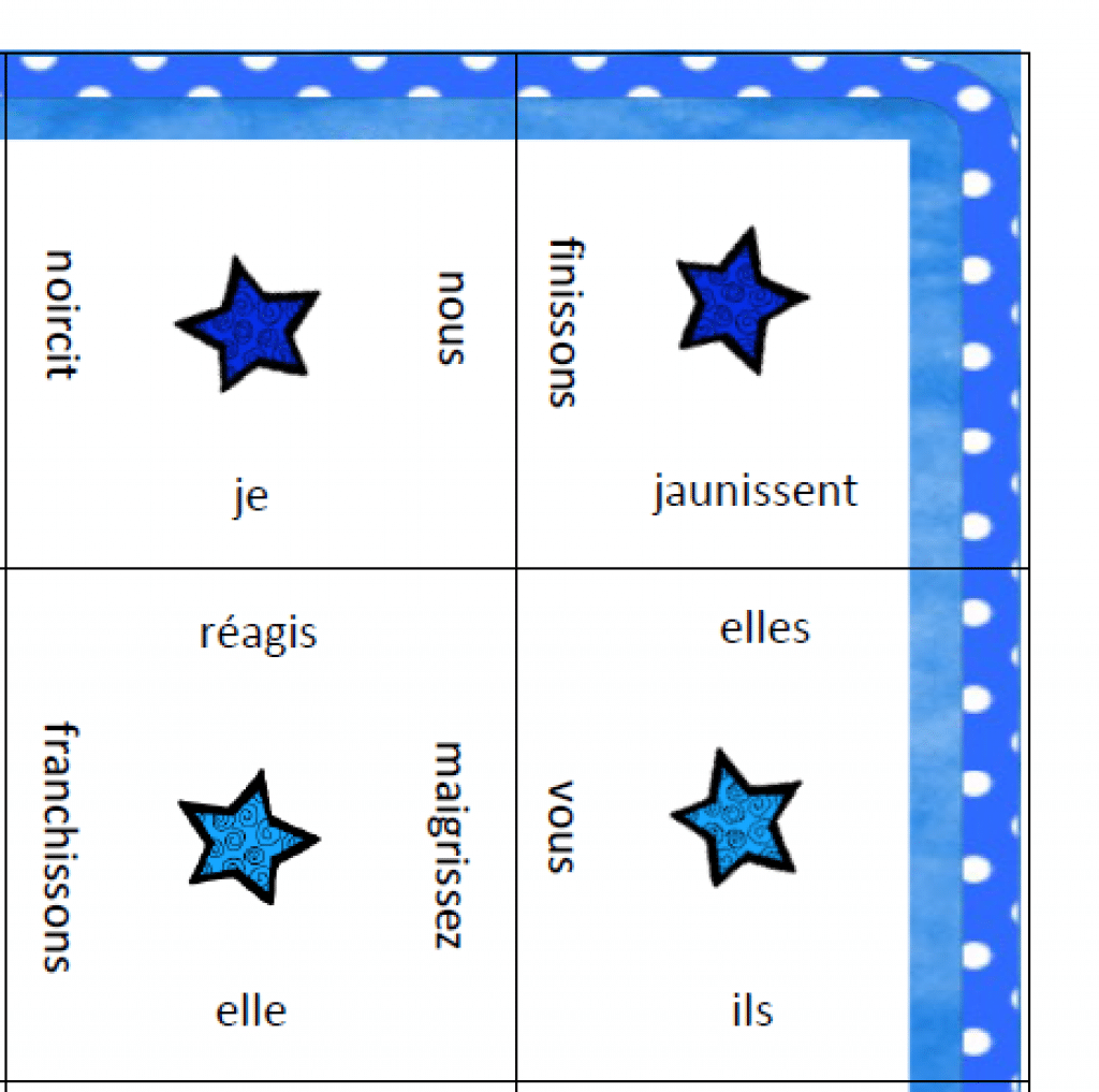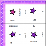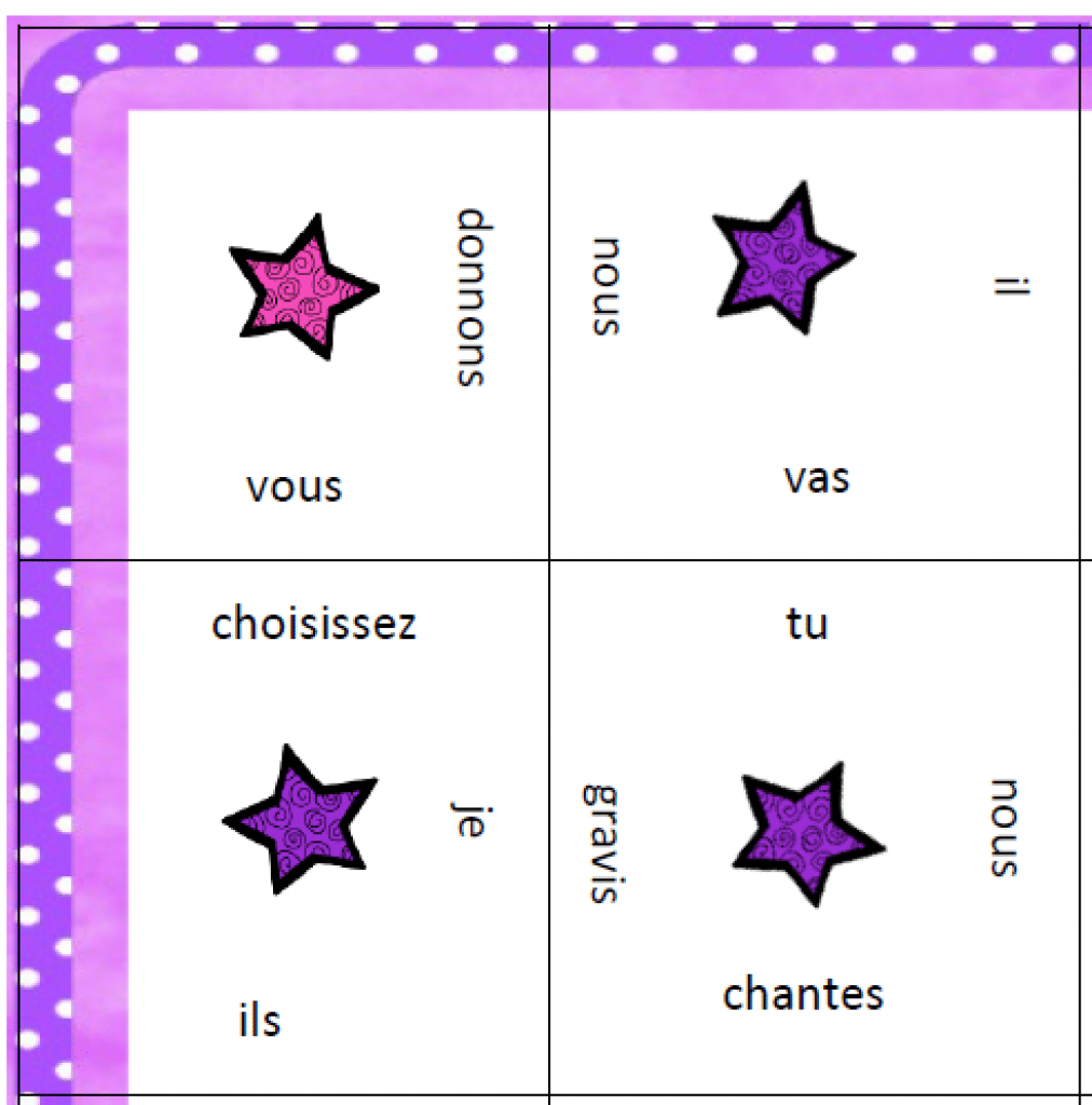 Le fichier comporte 4 carrés magiques : les verbes du 1er groupe, du 2e groupe, du 3e groupe et tous les verbes au présent (y compris être et avoir).