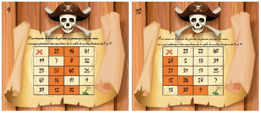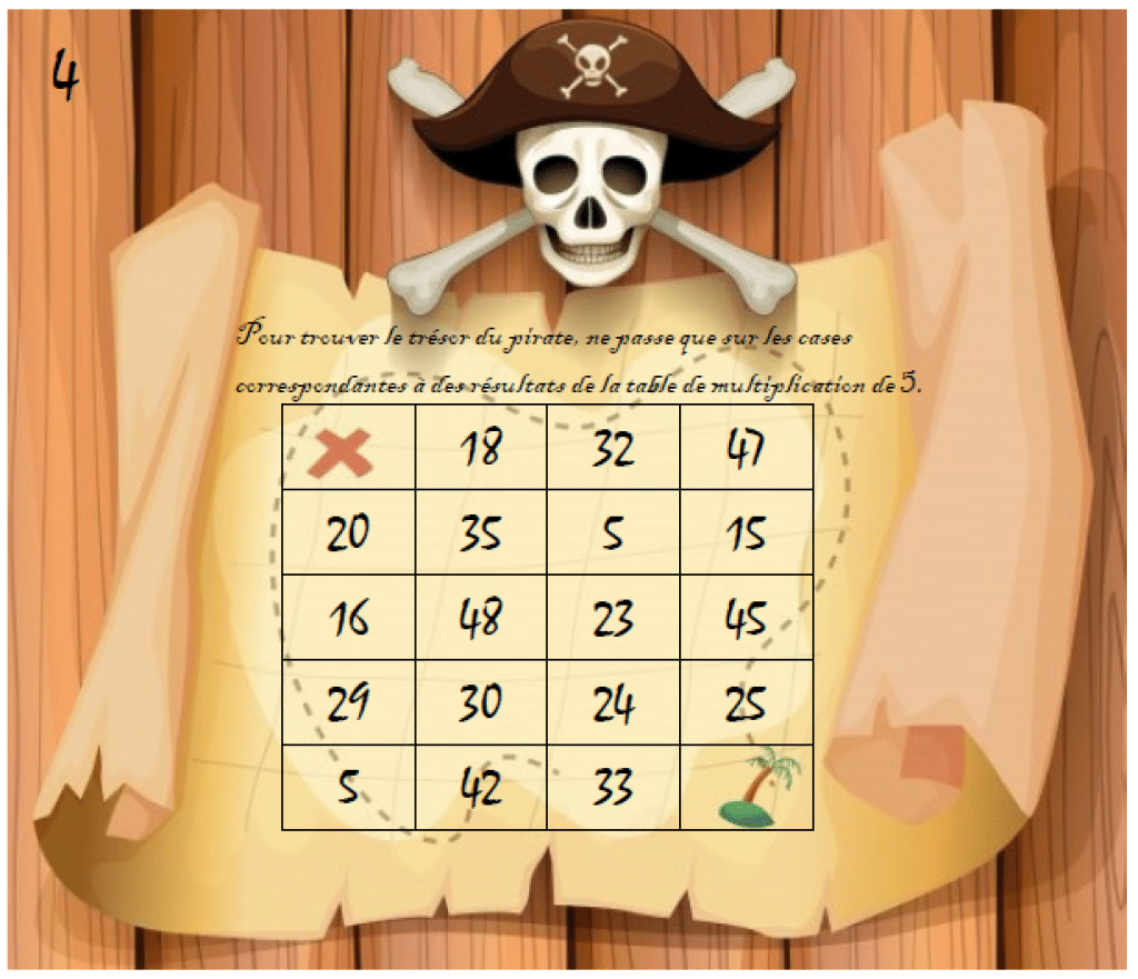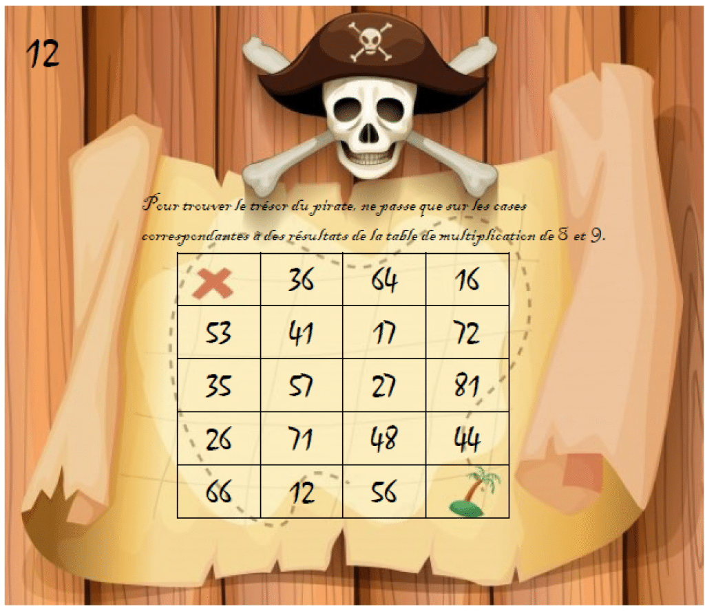 Chaque joueur prend une planche de jeu. Il doit partir de l’île pour se rendre sur la croix (à l’emplacement du trésor). Il ne doit passer que par des cases correspondantes aux résultats de la table de multiplication (ou des tables) demandée.