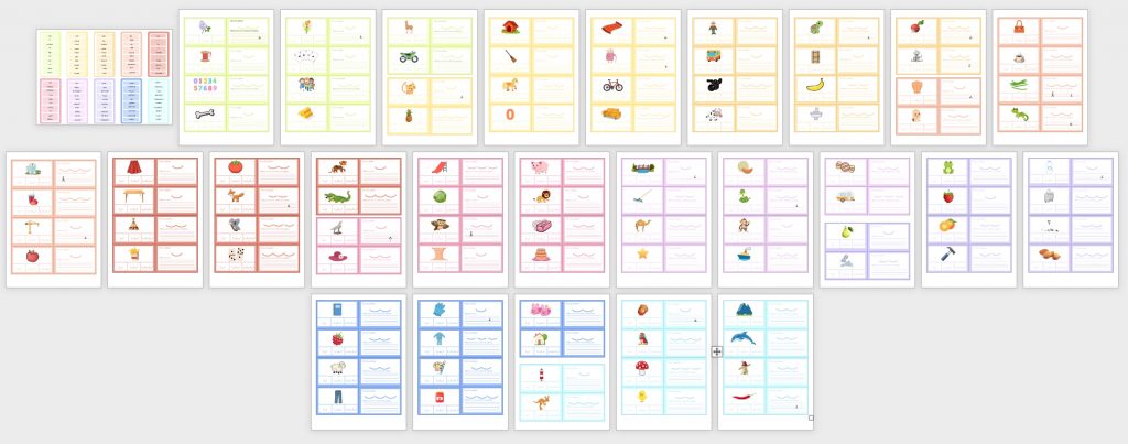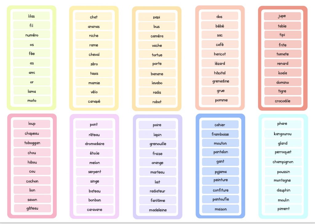 - Les exercices sont progressifs : les premières cartes n’utilisent que des sons simples, les suivants utilisent des graphèmes complexes.