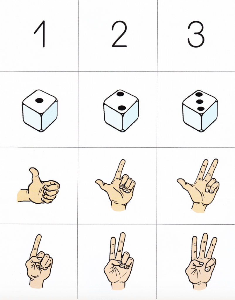 Ce sont des représentations des nombres de 1 à 3 au chiffres, doigts et dés.
