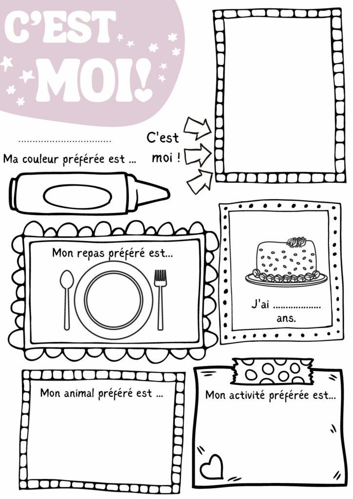 Une fois imprimée l’enfant peut y inscrire les informations le concernant, telles que, son prénom, son âge sa couleur préférée, son plat préféré, et même y coller sa plus belle photo. Pour une meilleur conservation dans le temps, nous suggérons de plastifier le document une fois rempli.