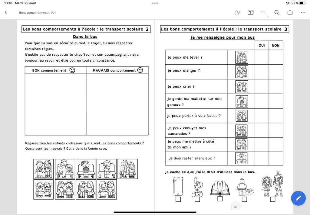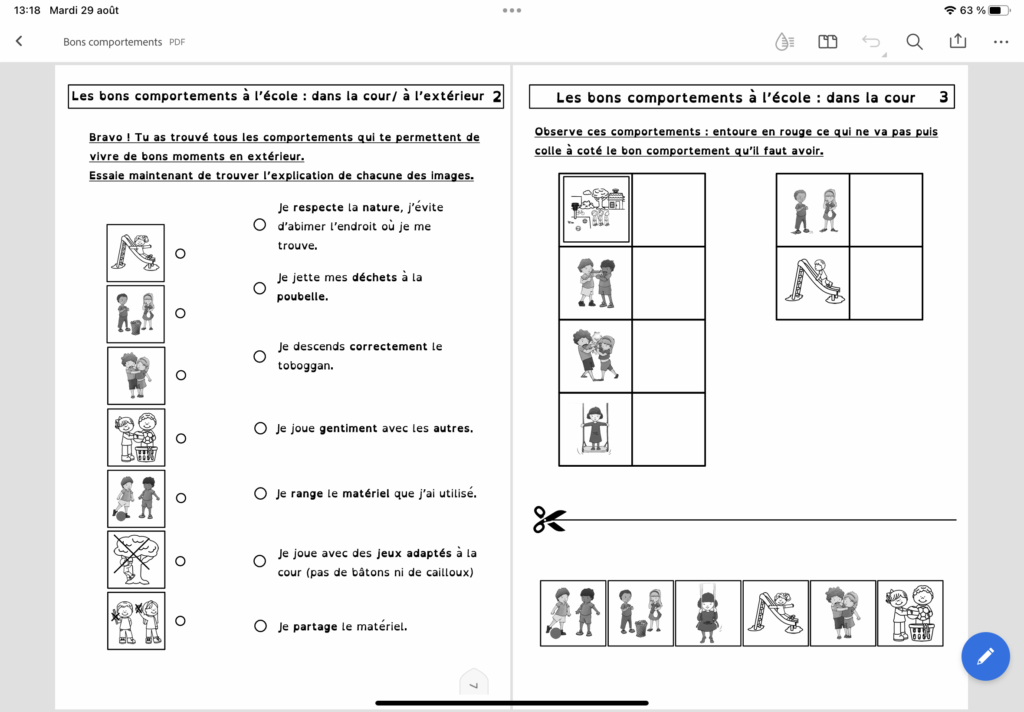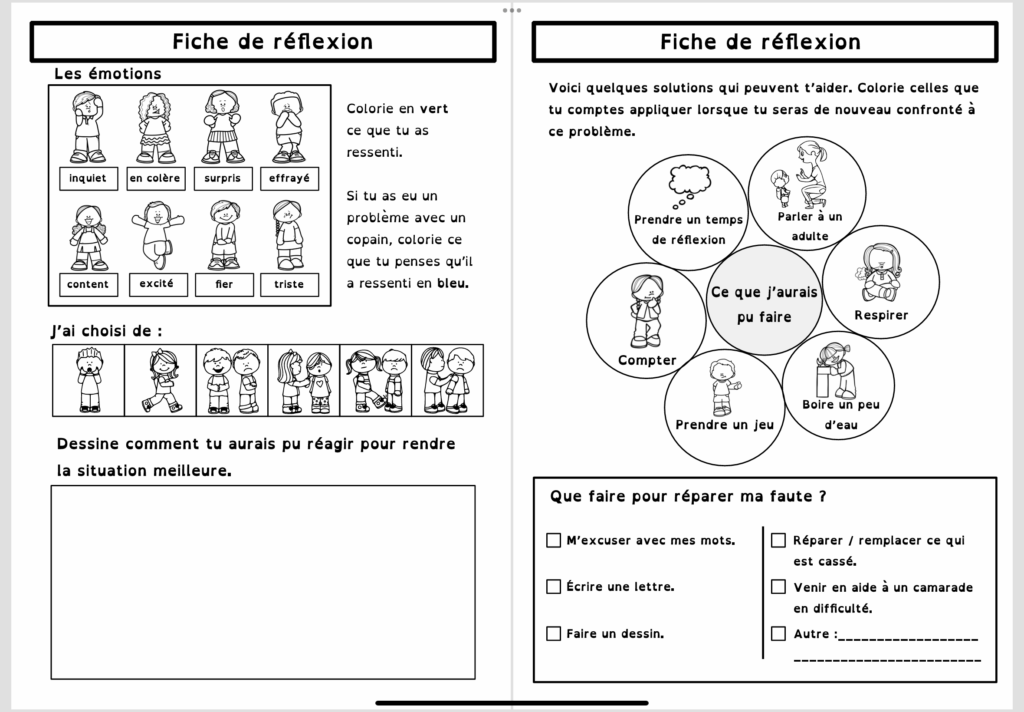 Activités à mener avec les enfants sur les bons comportements dans et autour de l’école, plus fiches réflexives pour aider à comprendre les erreurs commises et tendre vers des comportements positifs.