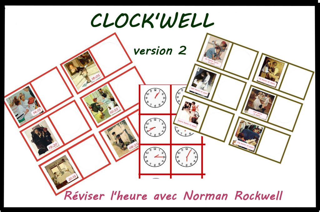 Cet atelier comprend 6 planches avec chacune 6 œuvres d’art. Il s’agit de placer les cartes horloges à côté des bonnes œuvres de Norman Rockwell.