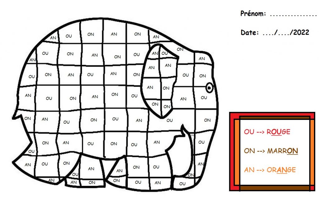 Je vous propose un coloriage magique d’Elmer qui permet de réviser/consolider les sons: [ou], [on] et [an].