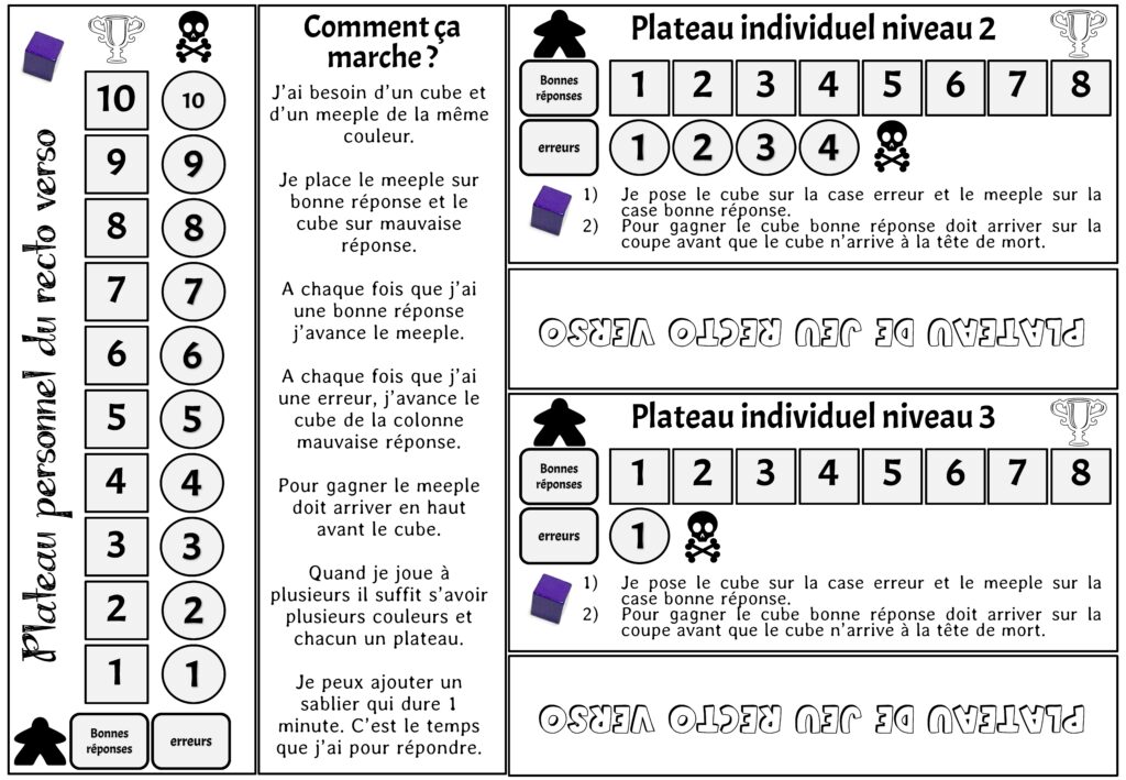 Pour jouer il vous faut 1 pince à lingue, un meeple et un cube et cette carte. Le but est de choisir la bonne réponse parmi celle proposées. C’est un fichier auto-correctif car le réponse se trouve en verso.