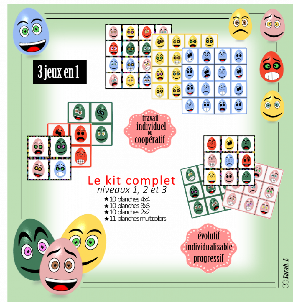 • 40 planches de jeu et ses cartes. Les supports sont de 3 tailles différentes (pour adapter le jeu en fonction de chaque élève)