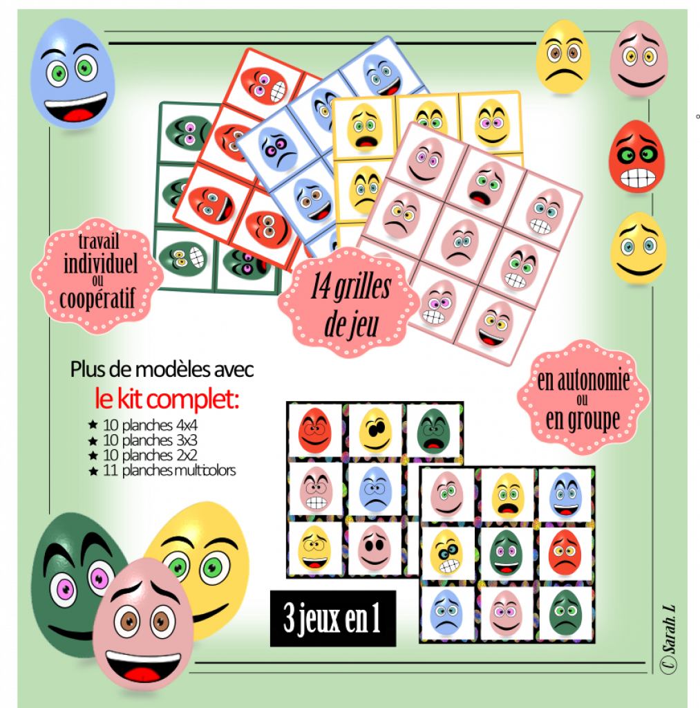 - 14 planches de jeu et ses cartes. Les supports sont de 3 tailles différentes (pour adapter le jeu en fonction de chaque élève)