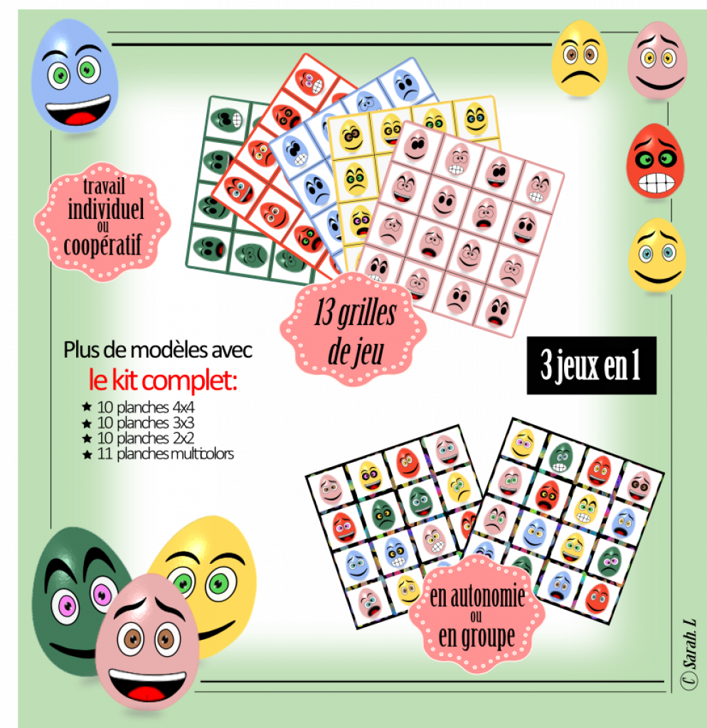 - 13 planches de jeu et ses cartes. Les supports sont de 3 tailles différentes (pour adapter le jeu en fonction de chaque élève)