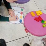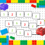 Tous les enfants ont une tour de 5 légos. A tour de rôle ils lancent le dé et avancent leur pion en conséquence. S’ils tombent sur un chiffre vert, ils ajoutent le nombre de légo indiqués. S’ils tombent sur un chiffre rouge, ils retirent le nombre de légos indiqués.