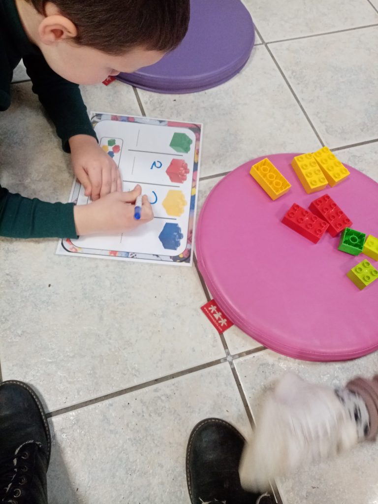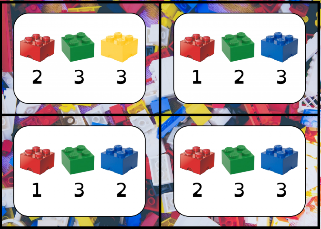 Par binôme. Il y a un marchant et un client. Le marchant, carte en main, indique au client le nombre de légo bleu dont il aura besoin, puis le nombre de rouge, de jaune et de vert. Le client va chercher petit à petit le bon nombre de légo de chaque couleur. Une fois cela fait, le marchant et le client vérifient ensemble.