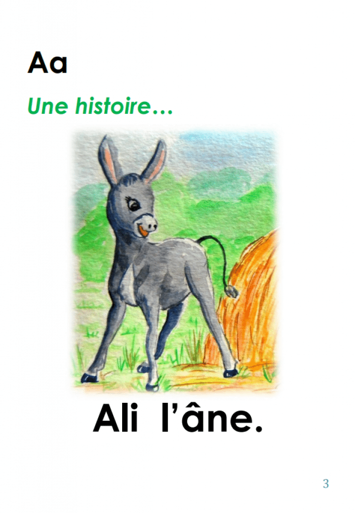 Ce livret lecture « Ali l’âne » est le premier volume de : « Des lettres, des mots, des histoires » une méthode de lecture complète et progressive qui s’adapte à l’âge et au rythme de l’enfant.