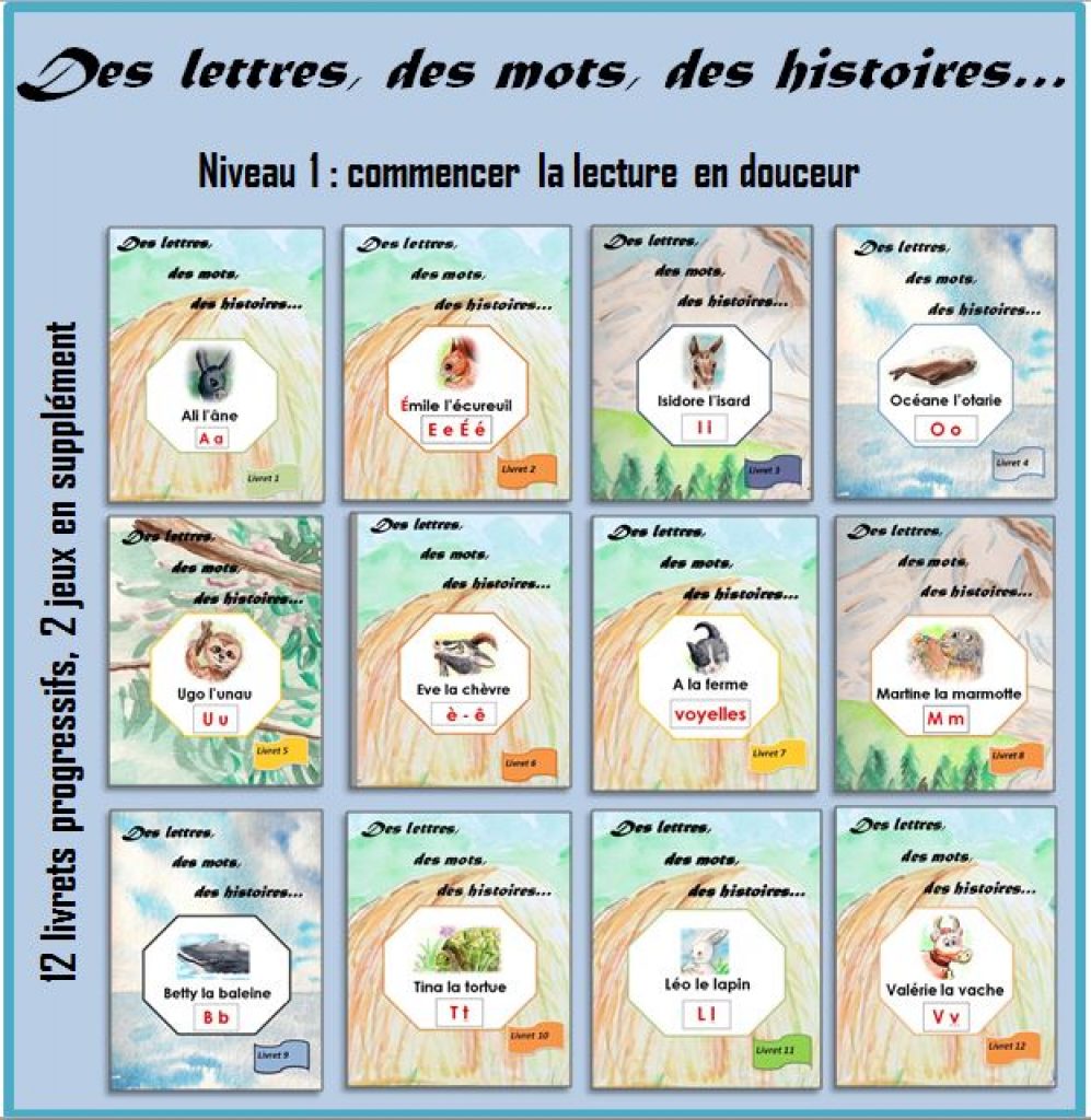 - 12 livrets qui introduisent les bases de la lecture: les sons des voyelles et les premières associations consonnes/ voyelles ainsi que des mots fréquents.