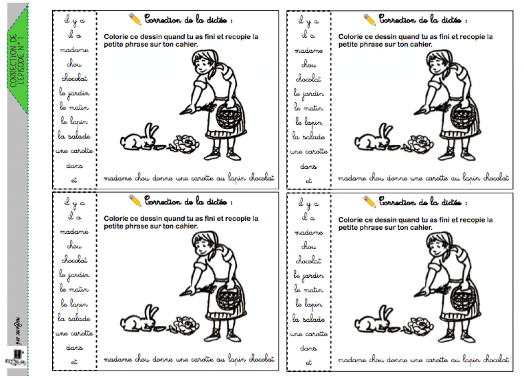 - Les corrections de dictées : petite fiche à coller dans le cahier pour aider les élèves à se corriger et un dessin original à colorier pour les plus rapides ;