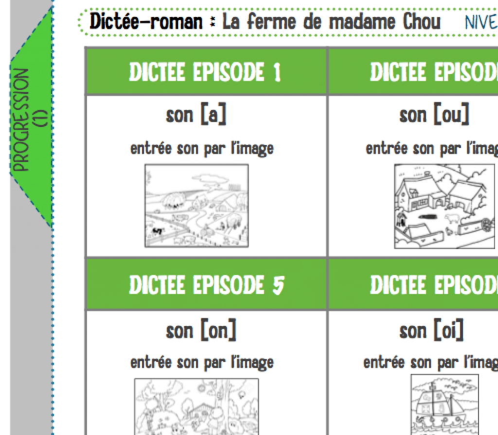 - 1 fiche de progression sur les sons abordés dans les 12 premières dictées ; 1 fiche récapitulative des mots étudiés au fil des dictées ; 1 fiche explicative sur un jeu d’introduction au son à mettre en place dès la dictée 10 ;