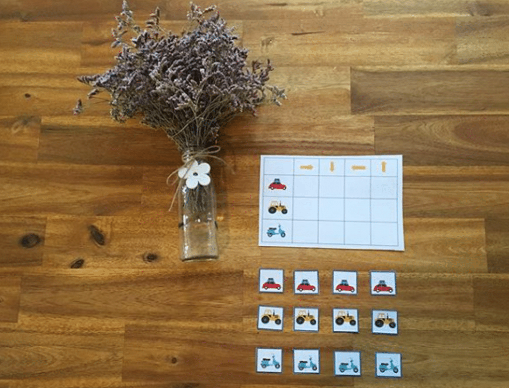 Par exemple pour placer la voiture : il faut regarder où se trouve l’avant de la voiture et la direction de la flèche pour placer l’étiquette correctement dans le tableau.