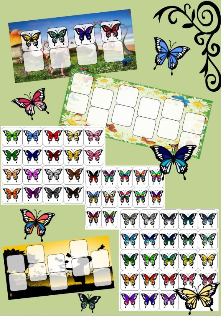 Placez des papillons sur les cases supérieures du support choisi (en fonction des enfants) et le reste des papillons sur la table. Les élèves doivent reconnaître et associer les papillons identiques.