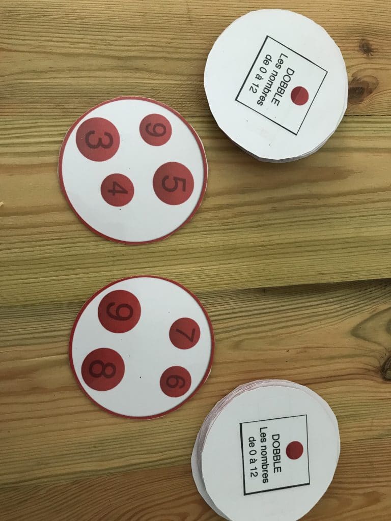 Règle du jeu: Les cartes sont distribuées de façon équitable (2 joueurs). Chaque joueur retourne une carte et le but est de repérer plus vite que son adversaire le nombre commun aux deux cartes. Le plus rapide des joueurs garde les cartes. Le gagnant est celui qui possède le plus de cartes à la fin de la partie.