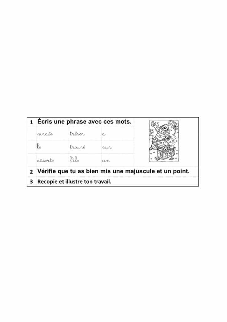 Chaque exercice propose entre 6 et 9 mots que l’enfant devra ordonner pour écrire une phrase.