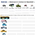 Cette page A4 au format PDF contient un exercice de recopiage, puis un exercice d’écriture, sur le thème des véhicules et moyens de transport.
