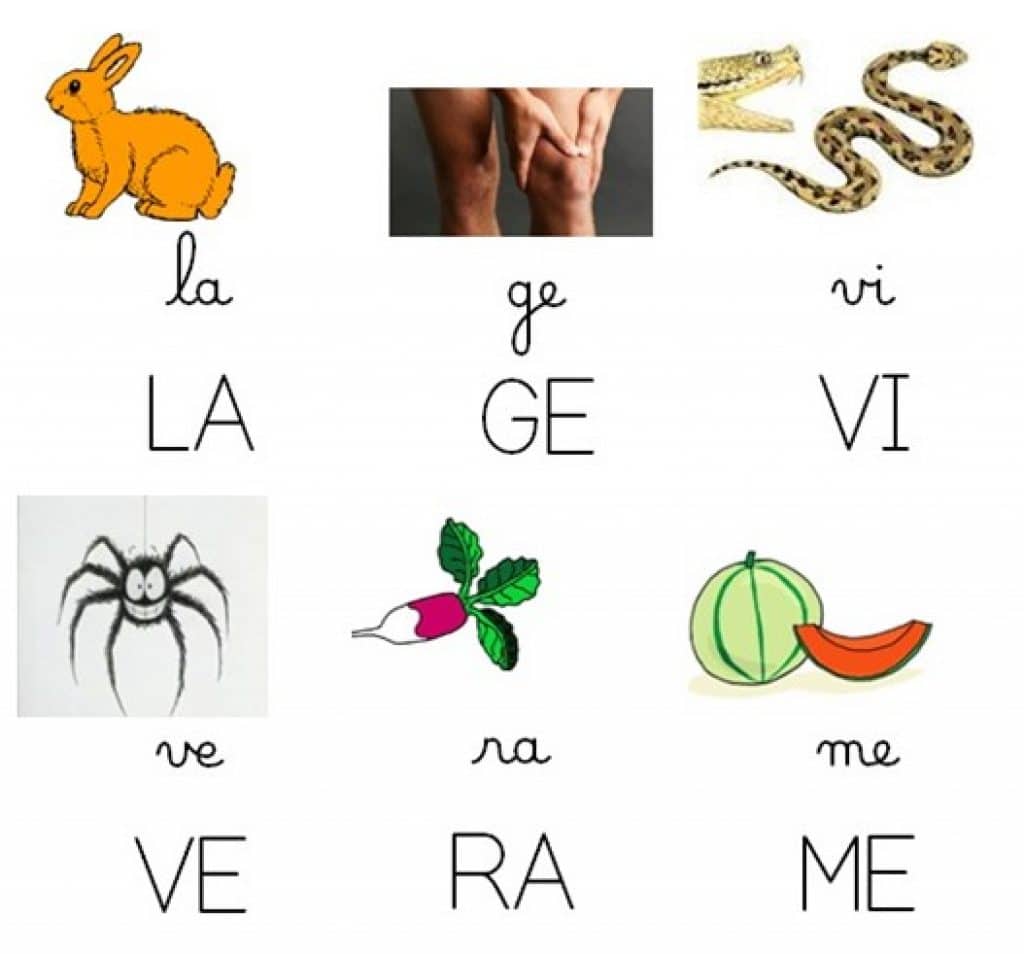 Chaque référent est une syllabe simple de 2 lettres (une consonne et une voyelle), première syllabe d’un mot tiré de la liste de Boisseau pour enfants de 5 ans, illustrée par une image qui sera reprise dans tous les exercices d’encodage.