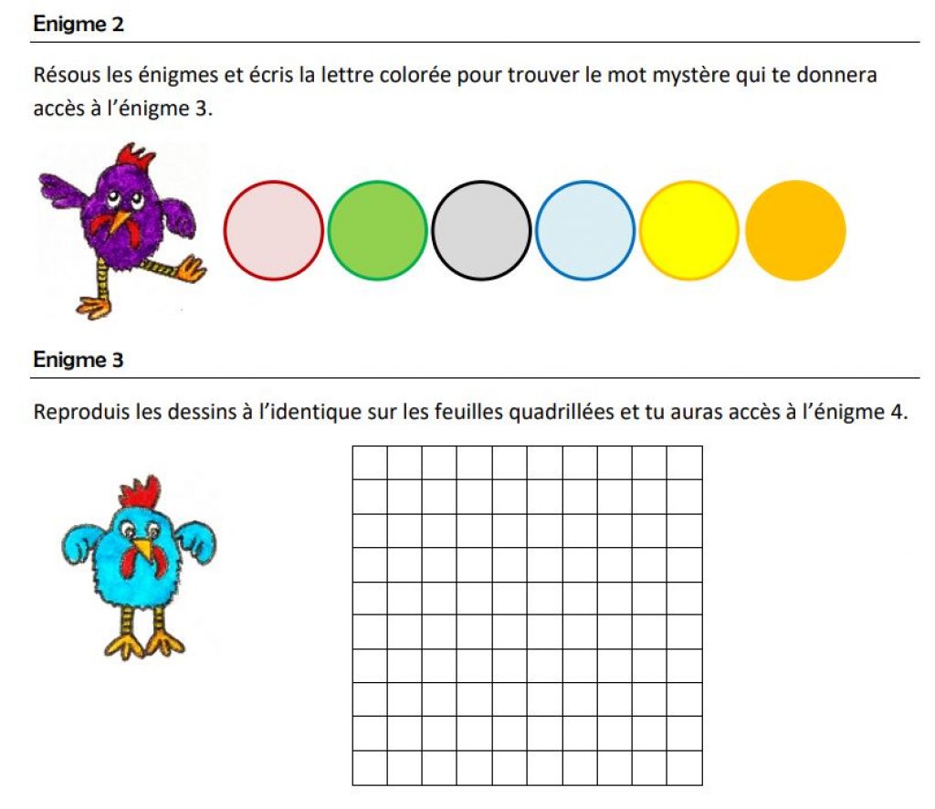 - Les cartes des 4 premières énigmes (pour ma part, je les aie plastifiée et mises sous enveloppe avec à chaque fois le numéro de l’énigme et l’avatar de poule (équipe rose, violette, verte et bleue)