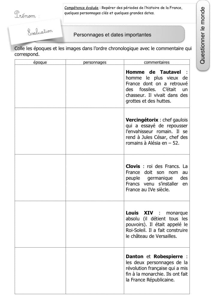 Compétence évaluée : Repérer des périodes de l’histoire de la France, quelques personnages clés et quelques grandes dates.
