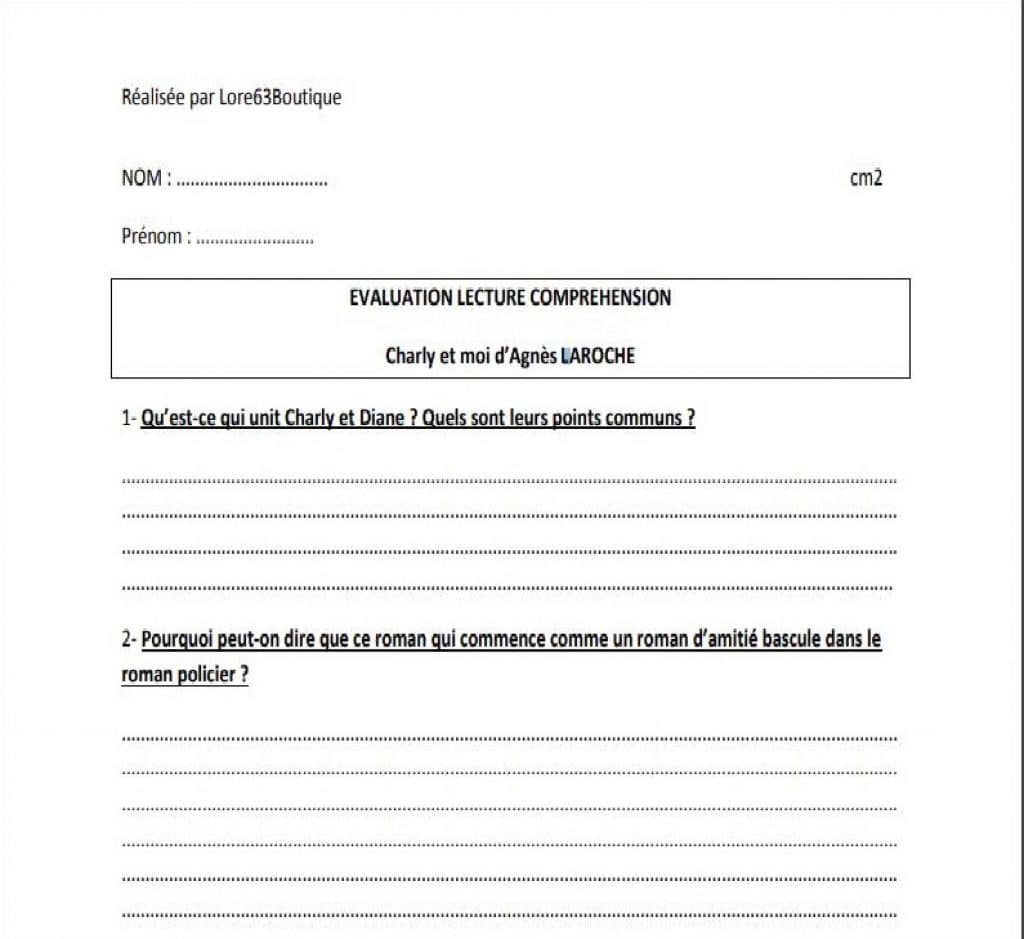 Évaluation de lecture : compréhension sur l’oeuvre « Charly et moi » d’Agnès LAROCHE.