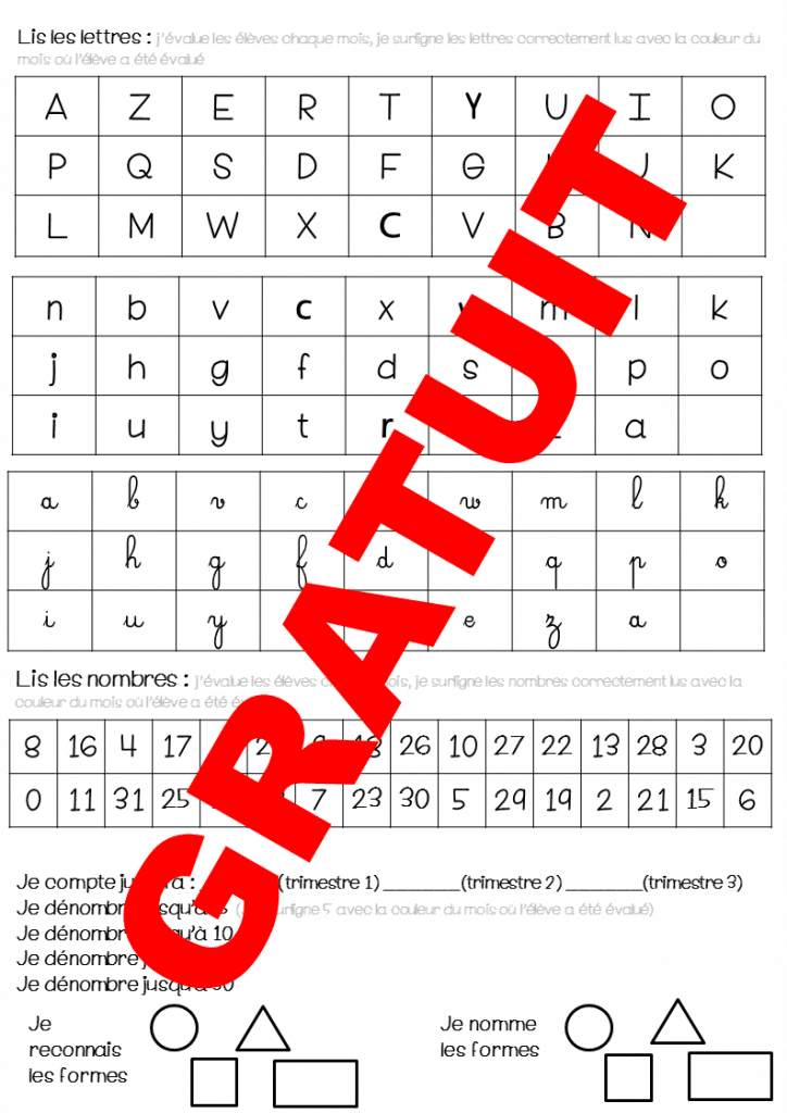 J’évalue l’écriture du prénom chaque mois, l’écriture des chiffres chaque trimestre, la lecture des lettres et des nombres (capitales, script, cursive chaque mois), la récitation de la suite numérique tous les trimestres, le dénombrement jusqu’à 5, 10, 20,30 tous les mois, les formes géométriques chaque mois.