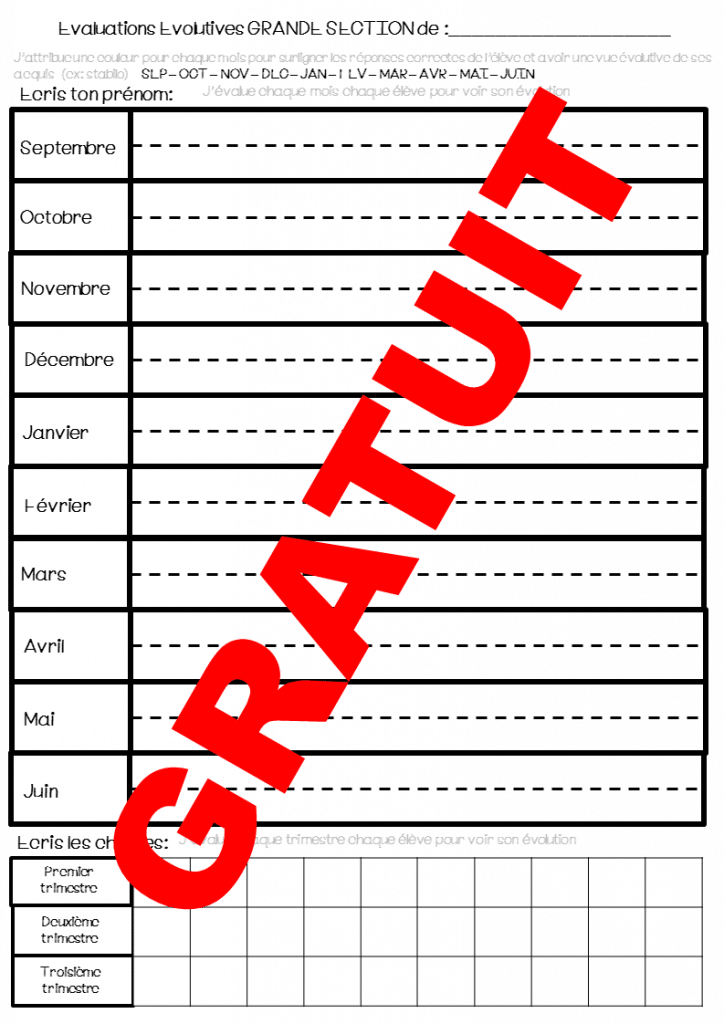 Tout tient sur 2 feuilles. J’attribue une couleur de surlignage pour chaque mois , et je surligne avec la couleur des mois ce qui est acquis. ça me permet visuellement de mieux repérer l’évolution de chaque élève.
