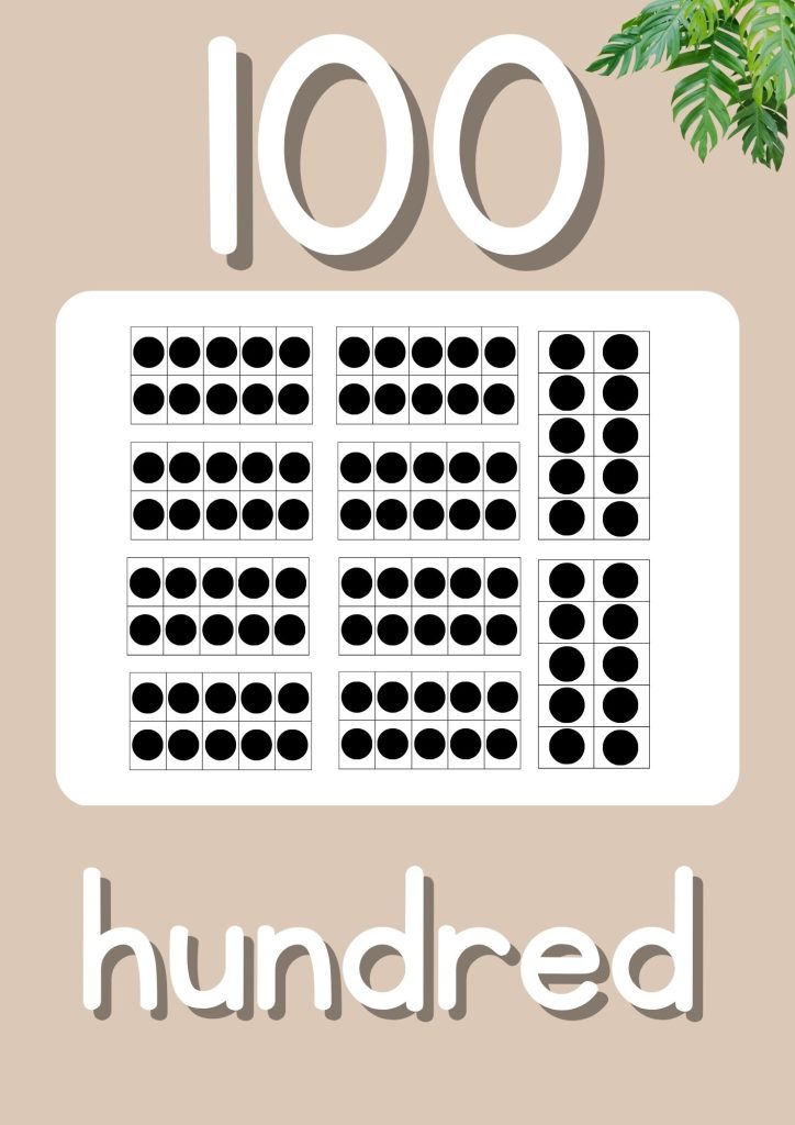 10 affiches avec les numéros 1 – 20, 30, 40, 50, 60, 70, 80, 90 et 100 dans trois langues différentes.