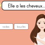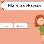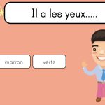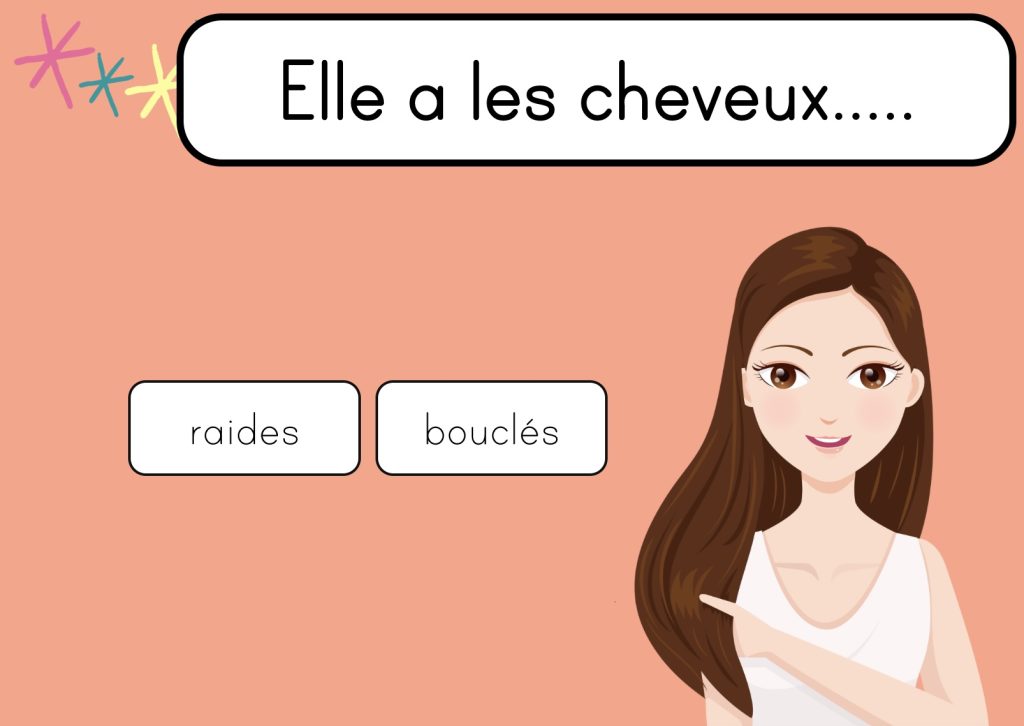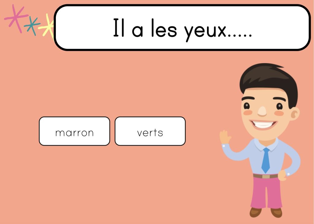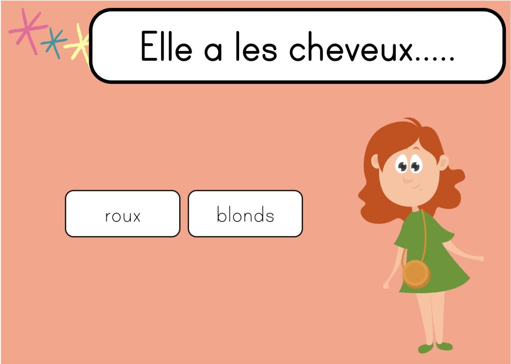 The vocabulary used is : il a, elle a, les yeux, bleus, marron, verts, noirs, les cheveux, bruns, blonds, roux, raides, frisés, longs, courts.