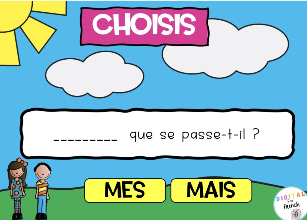 ⭐ Voici une activité GOOGLE SLIDES qui permettra à vos élèves de travailler les homophones MAIS – MES