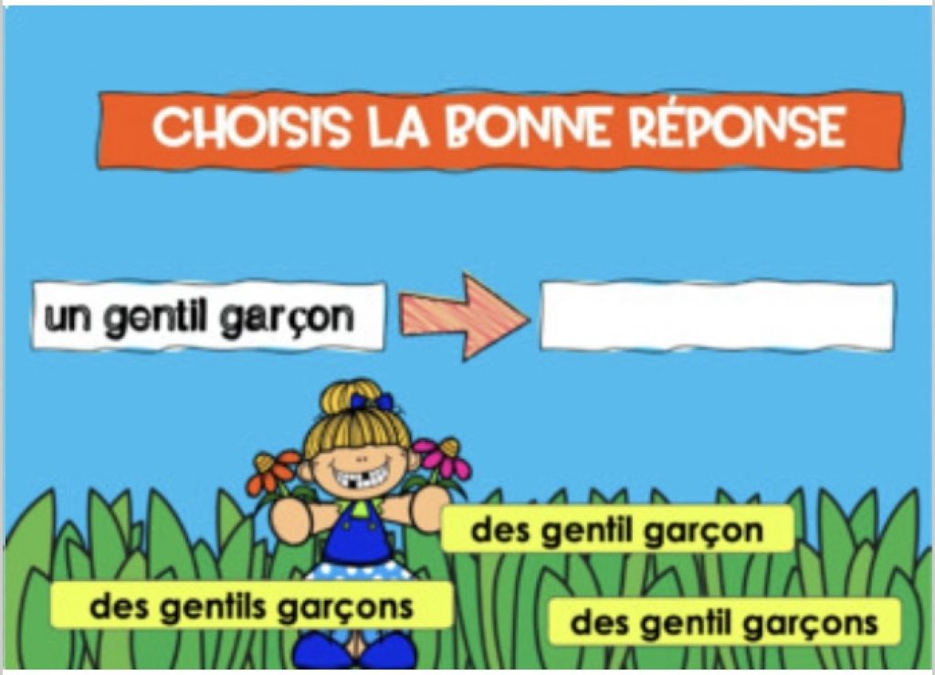 - Drag-&-drop: trouve le nom et adjectif au pluriel parmi 3 propositions (accord du groupe nominal)
