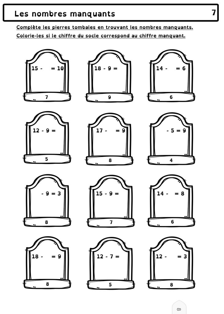 Ce fichier d’exercices de mathématique est basé sur la compréhension de la soustraction, avec passage par la dizaine (travail sur les nombres de 0 à 19), le but étant la familiarisation de l’enfant avec cette opération abstraite.
