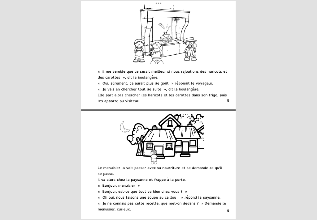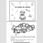 Dans le premier l’histoire « la soupe au caillou » retravaillée, sous forme d’un livret à lire et colorier pour les enfants.