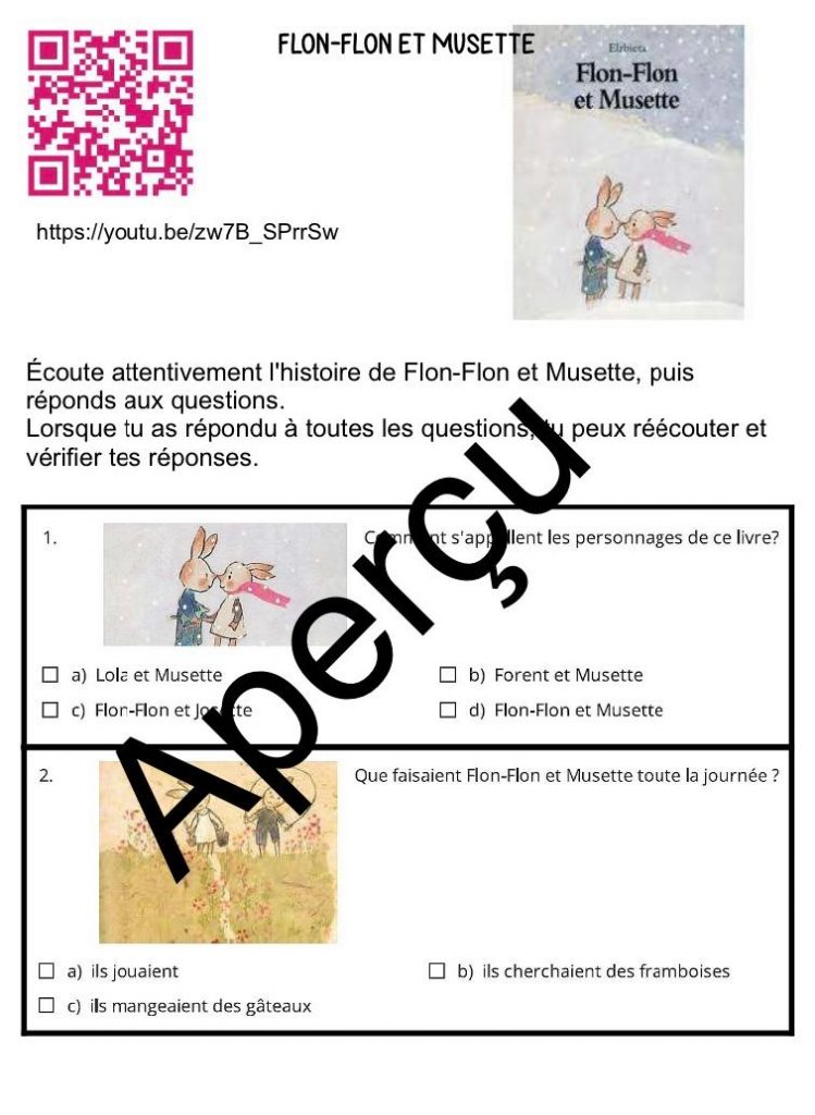 Après une écoute attentive de l’histoire, les enfants de ma classe recevront le questionnaire (pages 1 à 7) [volontairement aéré] et devront essayer de répondre aux questions.