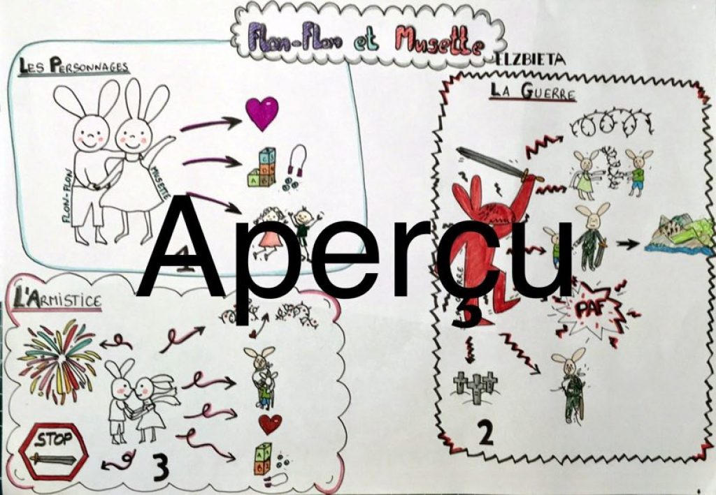 Enfin, pour aider à faire réexprimer l’histoire aux enfants, une page de sketchnoting est fournie (histoire racontée avec des dessins et des flèches = simplifiée).