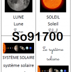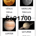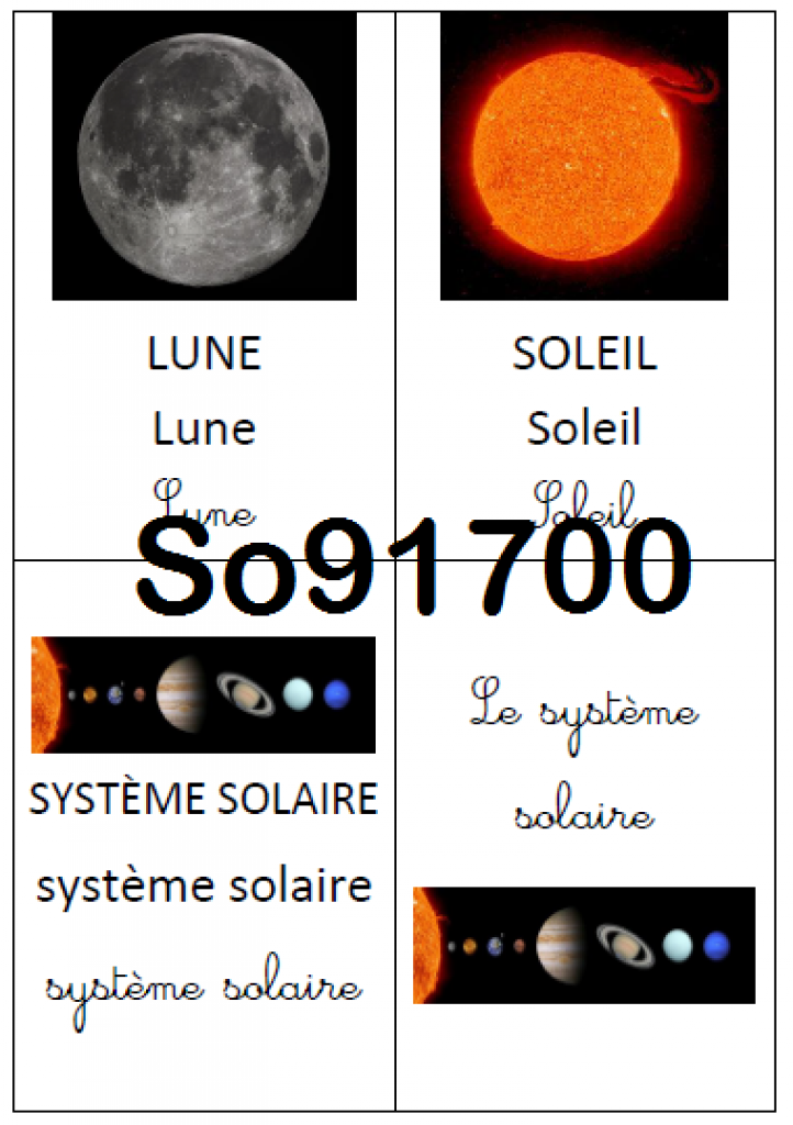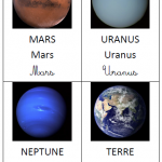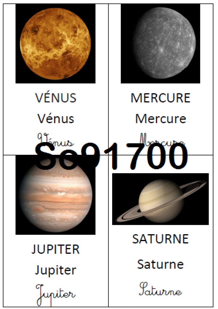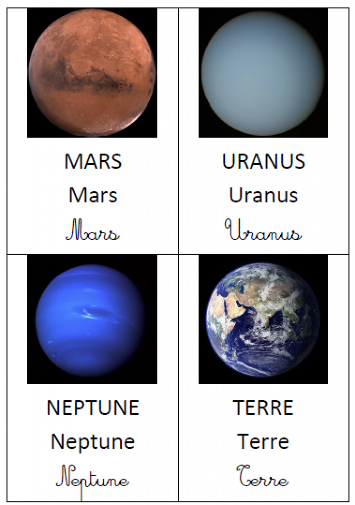 Imagier sur le système solaire contenant 11 cartes planète + une couverture. Chaque carte contient une photo d’une planète ou d’un satellite, et son nom écrit dans les 3 écritures (capitale, scripte et cursive).