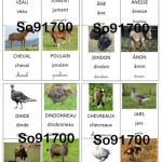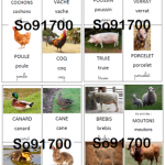 Imagier des animaux de la ferme contenant 35 cartes animaux + une couverture. Chaque carte contient une photo de l’animal, et son nom écrit dans les 3 écritures (capitale, scripte et cursive). Pour chaque animal il y a une carte pour le mâle, une pour la femelle, et une pour le petit.