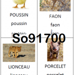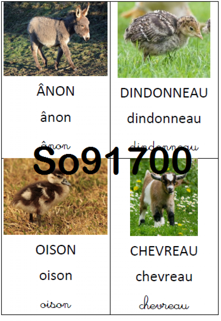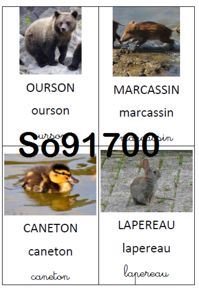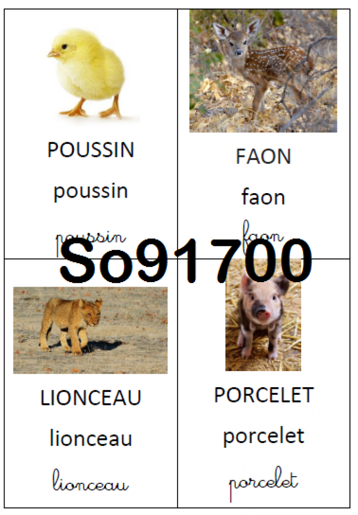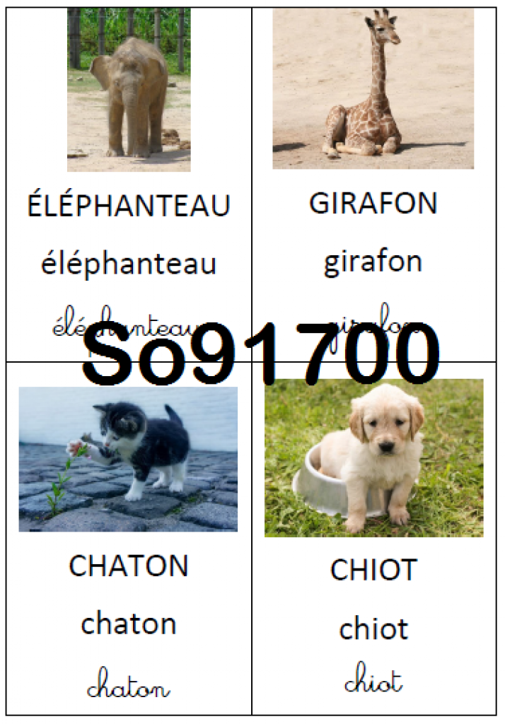 Imagier des bébés animaux contenant 19 cartes animaux + une couverture. Chaque carte contient une photo de l’animal, et son nom écrit dans les 3 écritures (capitale, scripte et cursive).