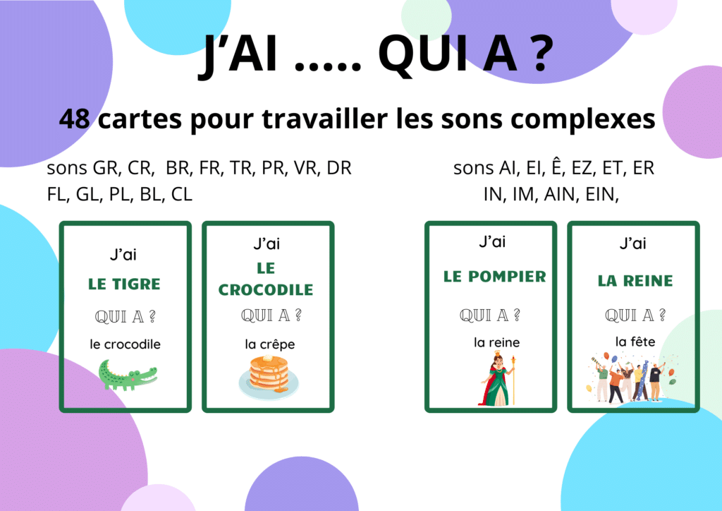 Chaque élève reçoit des cartes. Le plus jeune prend une carte et commence « J’ai …. » et demande « Qui a …? »