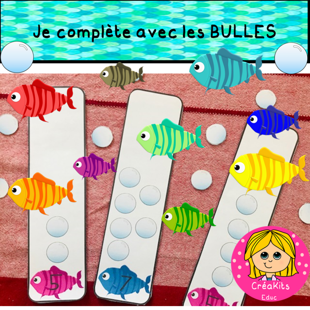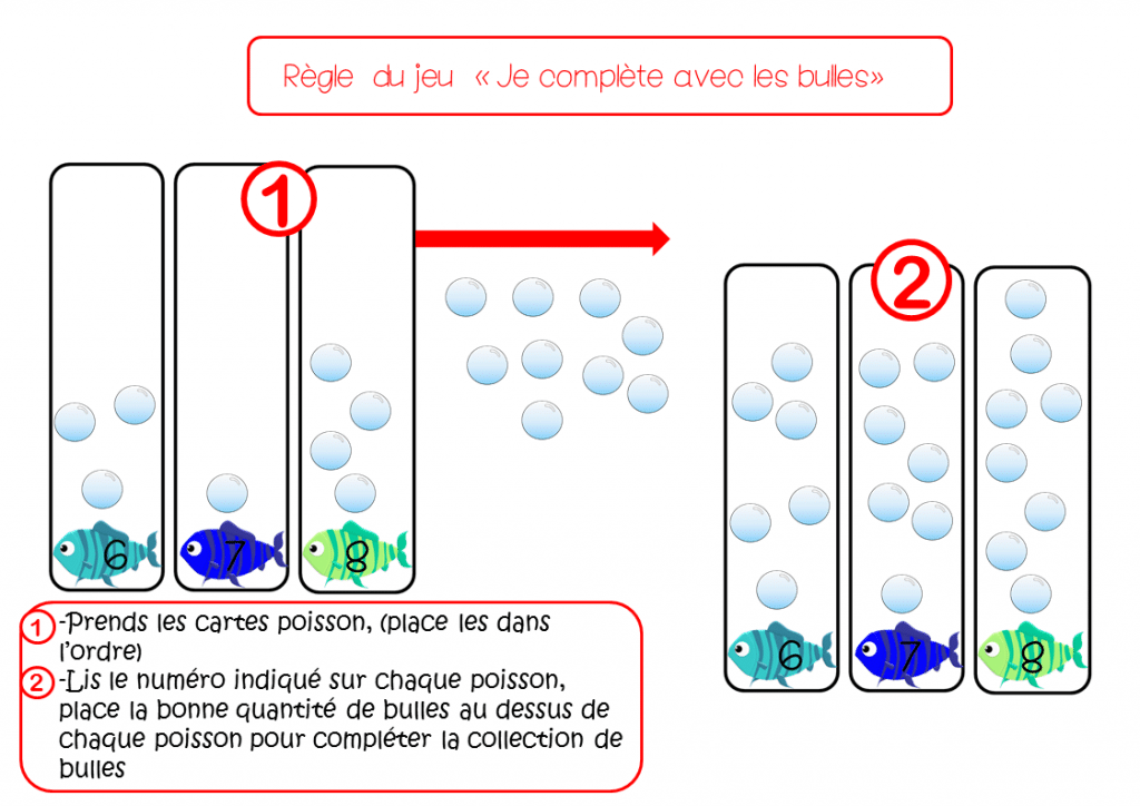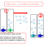 -Lis le numéro indiqué sur chaque poisson, place la bonne quantité de bulles au dessus de chaque poisson pour compléter la collection de bulles